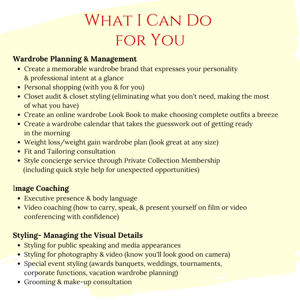 If you are looking to do more with your image than simply dress well, don’t wait another day. Contact me to find out how branding your wardrobe can help you achieve more.